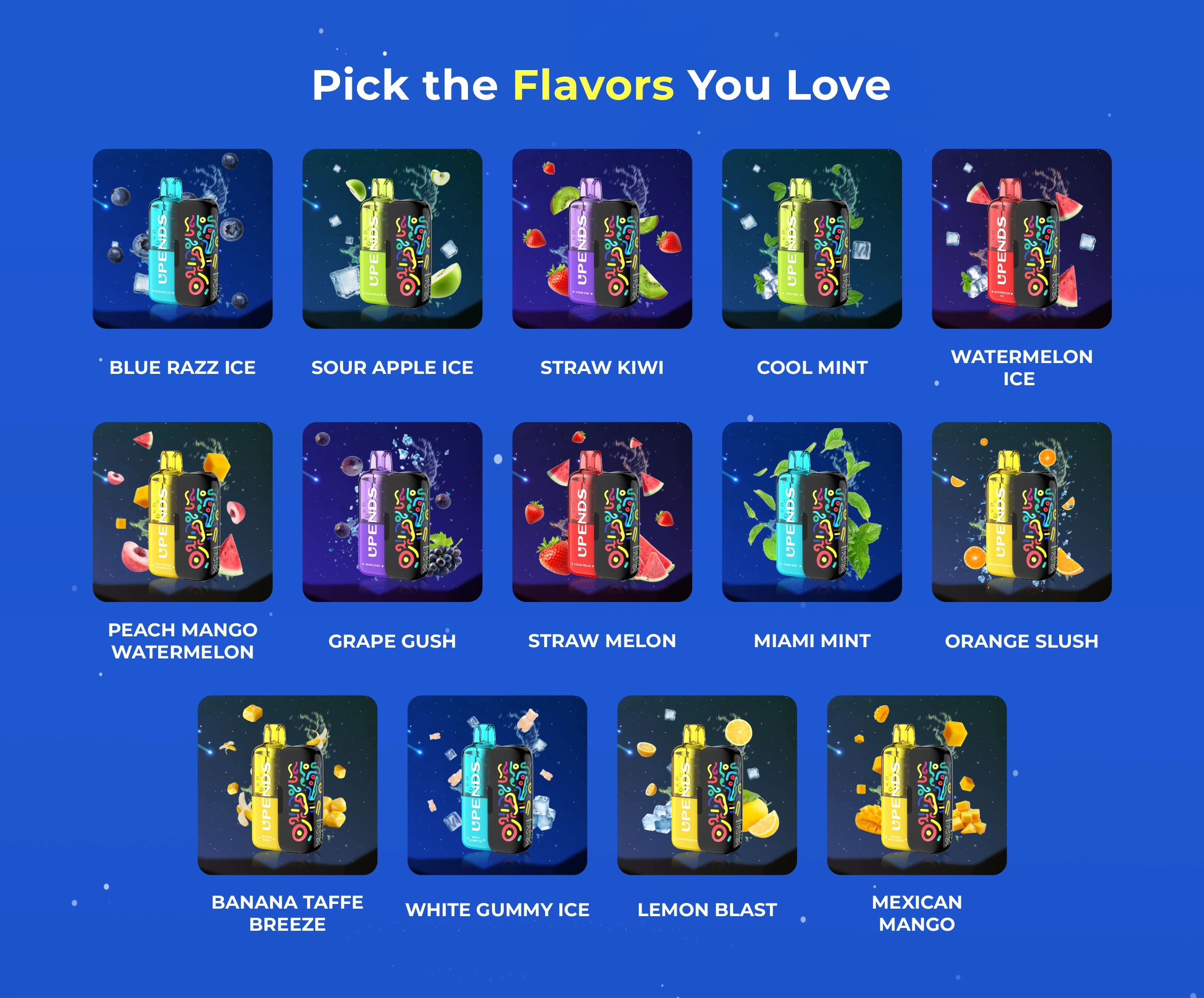 De UPENDS UP9 50K Puffs Disposable Vape is verkrijgbaar in tien smaken, variërend van fris en minty tot fruitig en zoet: